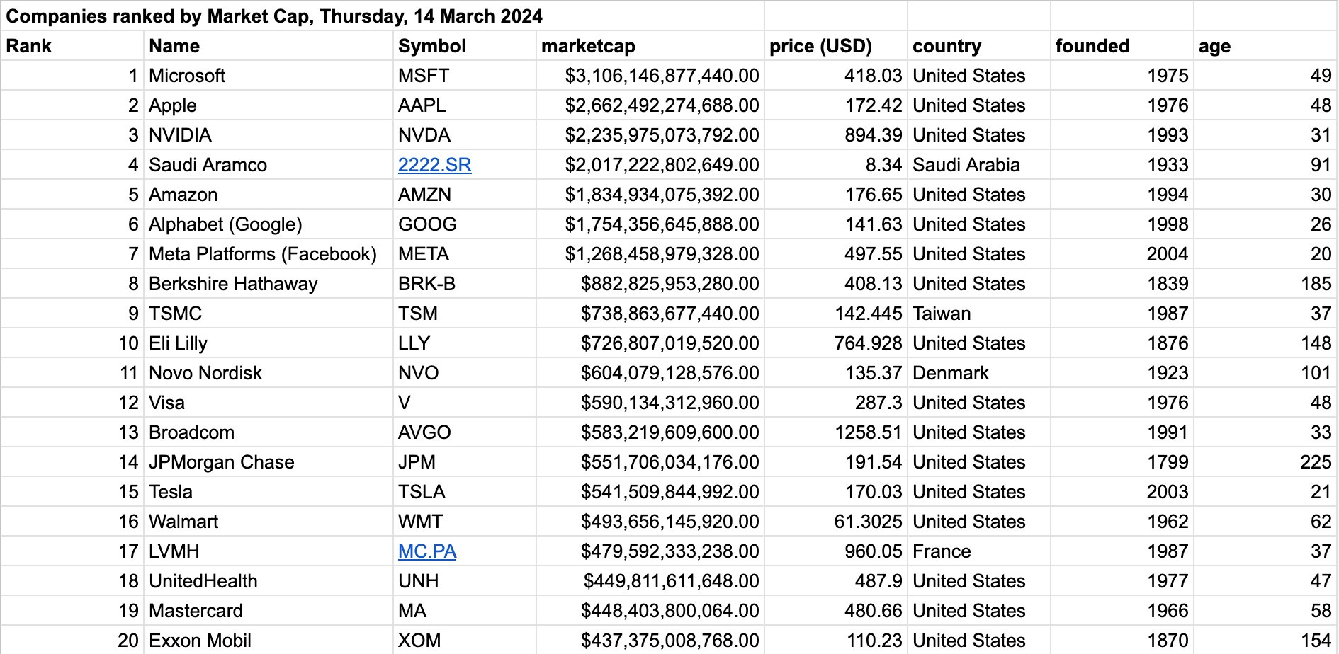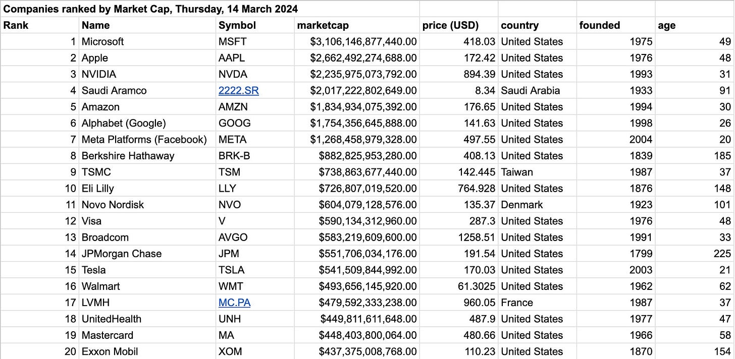 This is how the world's most valuable public companies by market cap spelled out on 14 March 2024.